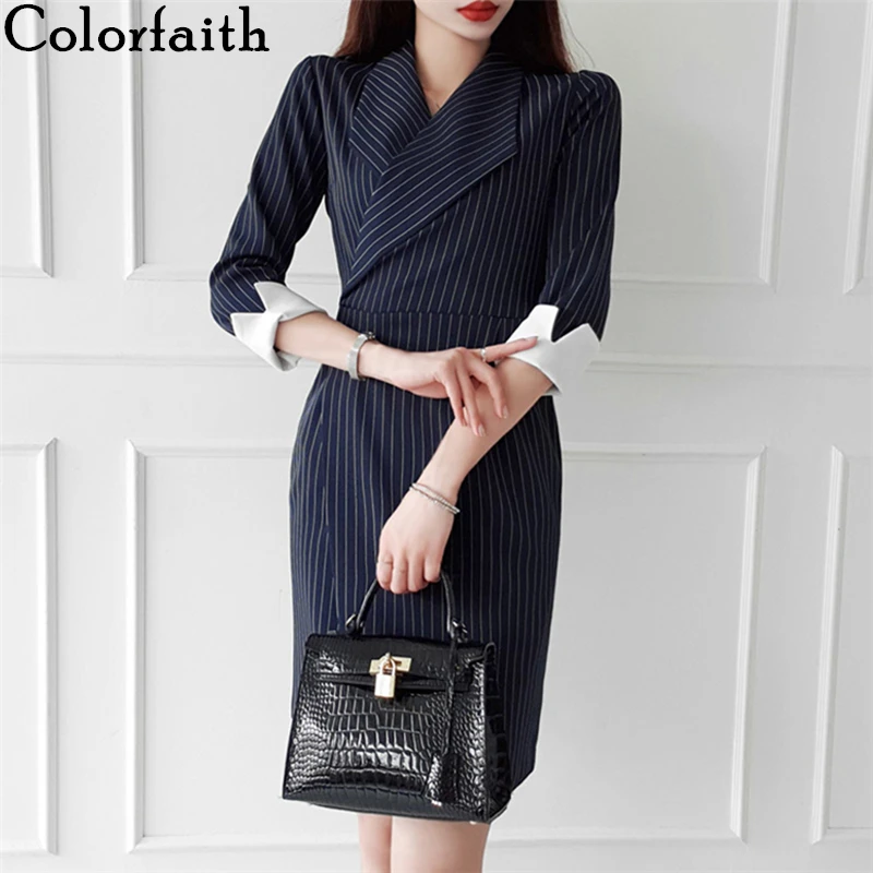 Colorfaith Новый 2020 Для женщин Летние Осенние платья Высокая Талия посылка бедра лоскутное элегантные полосатые Офисные женские туфли мини платье DR7917