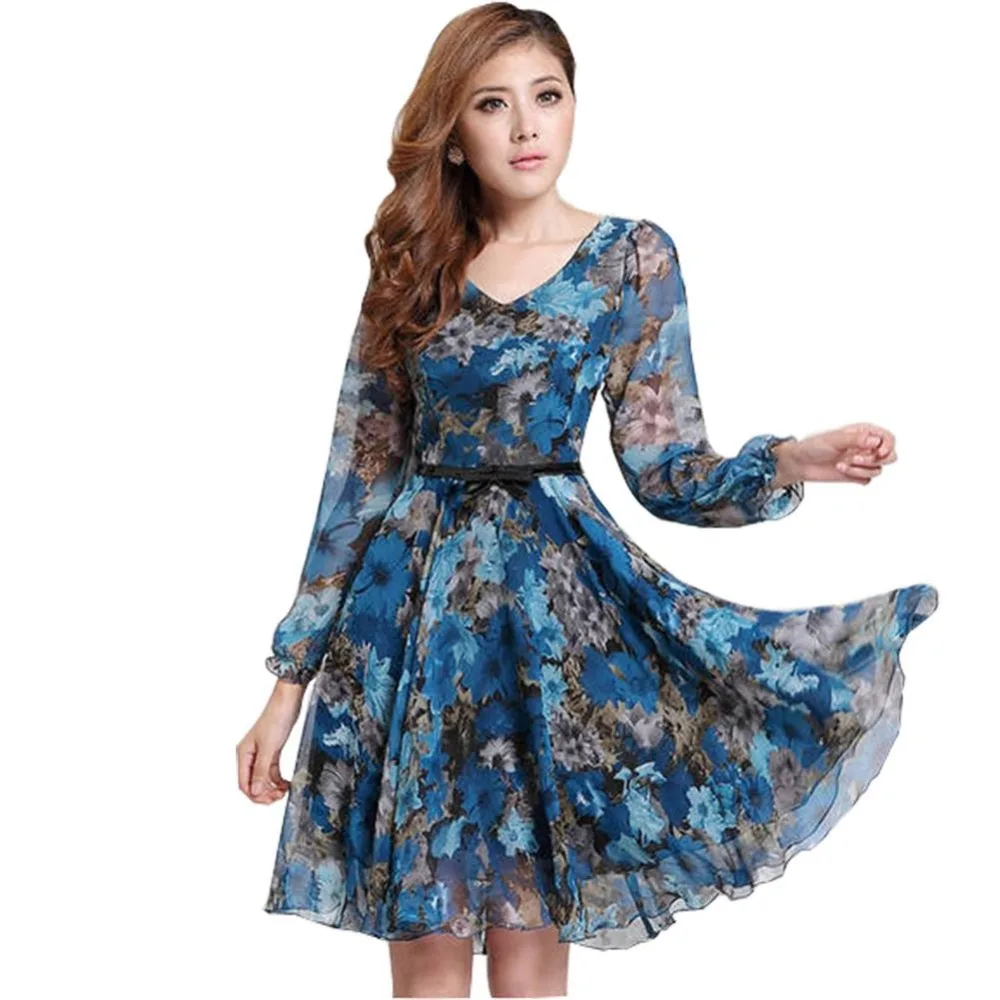 Женское винтажное платье с цветочным принтом, большие размеры, милое женское повседневное летнее шифоновое платье с длинным рукавом и v-образным вырезом в китайском стиле, Лидер продаж