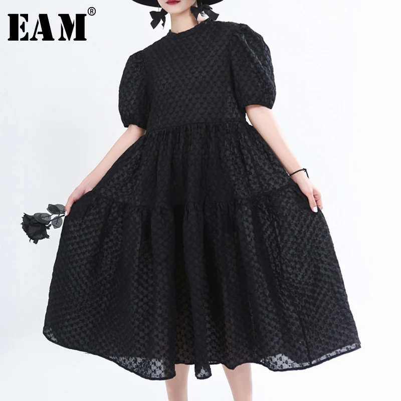 [EAM] Women Black Pattern Printed Temperament Dress New Round Neck Puff Sleeve Loose Fit Fashion Tide Spring Summer 2020 1T929