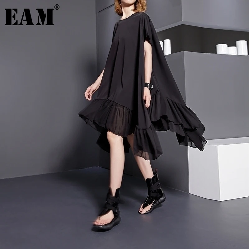 [EAM] 2017 new summer autumn round neck short sleeve solid color black split joint loose big size dress women fashion tide 446