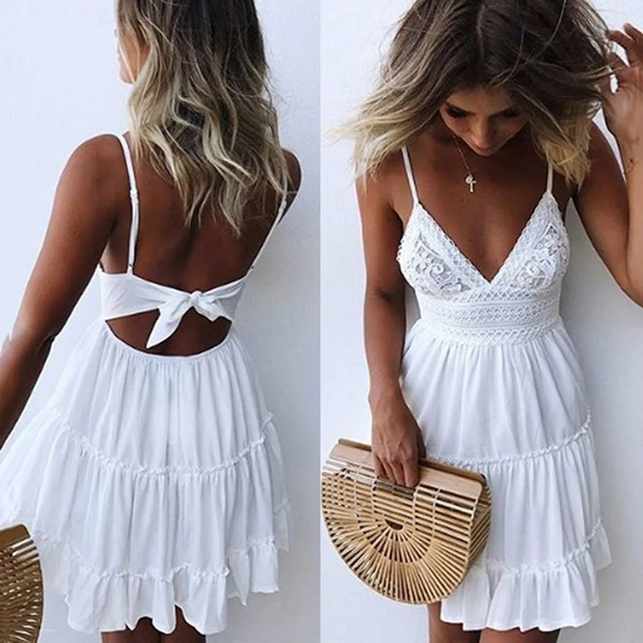2018 Новое модное летнее платье женское Милое сексуальное платье без рукавов с v-образным вырезом с открытой спиной кружевное сшитое пляжное ...