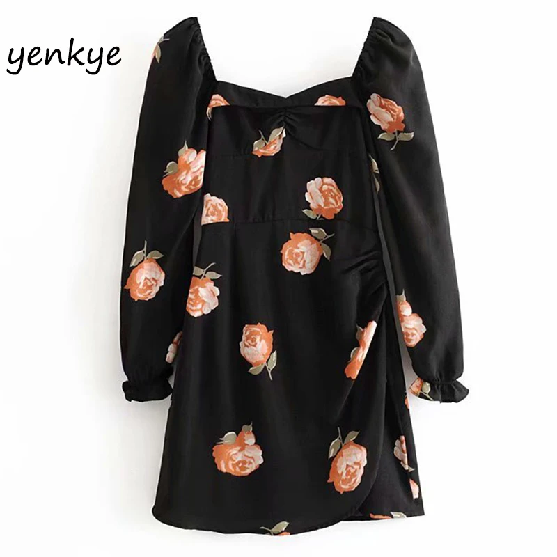 Женское винтажное облегающее мини-платье с цветочным принтом, сексуальное летнее платье с длинным рукавом и квадратным вырезом DDOM9206
