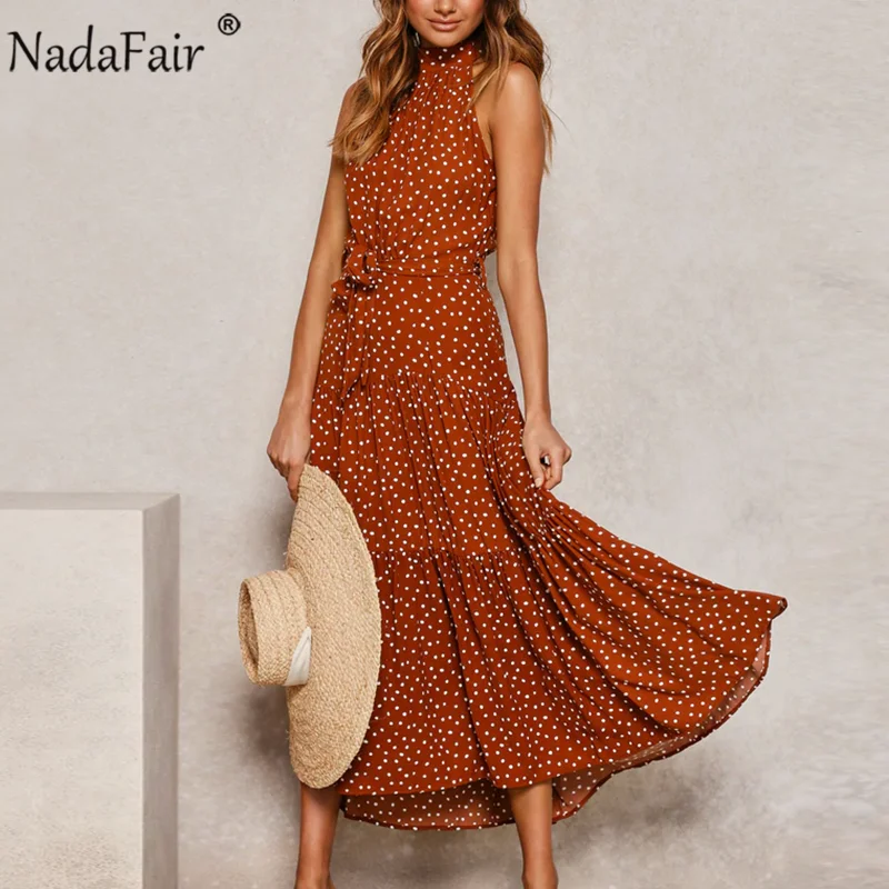 Nadafair А-силуэт Холтер без рукавов черный белый летнее пляжное длинное платье с поясом Бохо макси в горошек платья для женщин