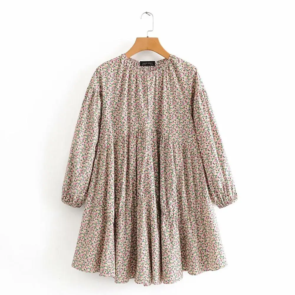 Новинка 2020 женское шикарное повседневное свободное платье с круглым вырезом и цветочным принтом, женское платье с рукавами-фонариками, большие платья со складками