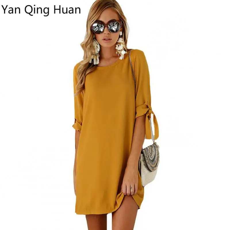 Yan Qing Huan/летнее популярное новое платье с круглым вырезом и пятиточечным рукавом, однотонное свободное женское платье с бантом