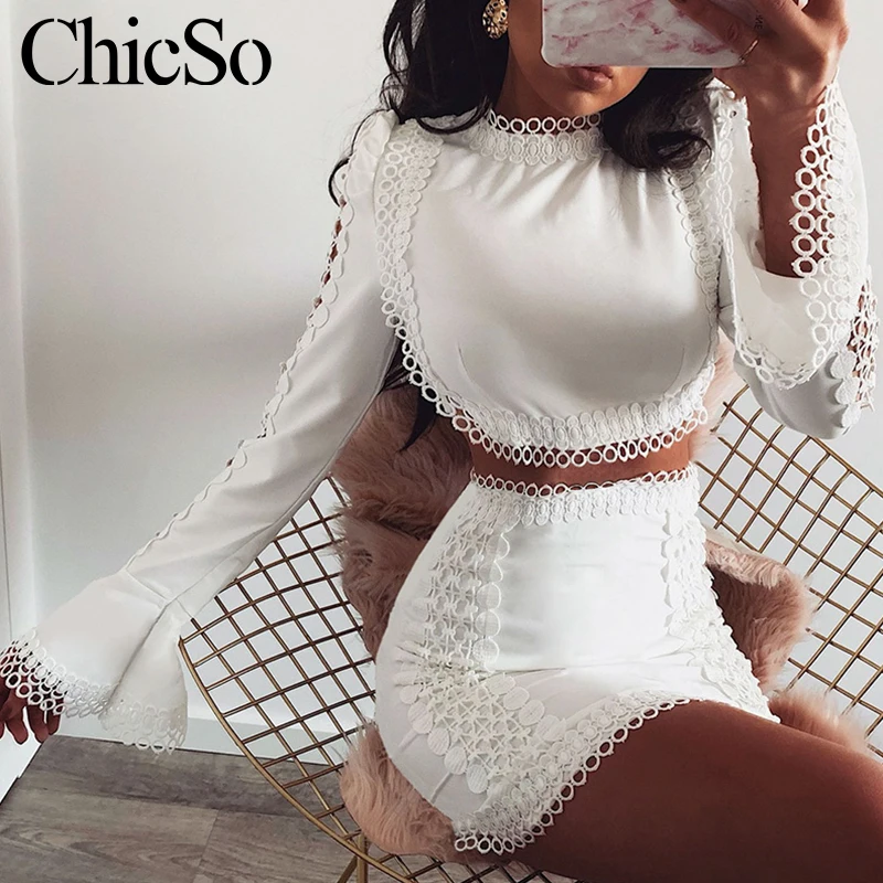 MissyChilli длинный рукав «фонарик» Кружевное белое платье женское элегантное облегающее 2 Костюм из нескольких предметов осеннее платье пикант...
