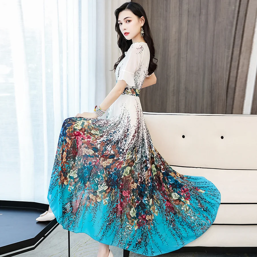 Лидер продаж 2020, весеннее женское шифоновое платье с цветочным принтом, длинное повседневное тонкое винтажное длинное платье с высокой талией и шнуровкой, Boho Vestidos