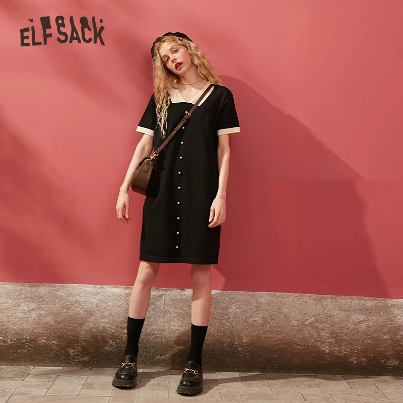 ELFSACK, белое однотонное повседневное женское платье на одной пуговице с жемчугом, весна 2020, черные платья с длинным рукавом в Корейском стиле для девушек, повседневные платья