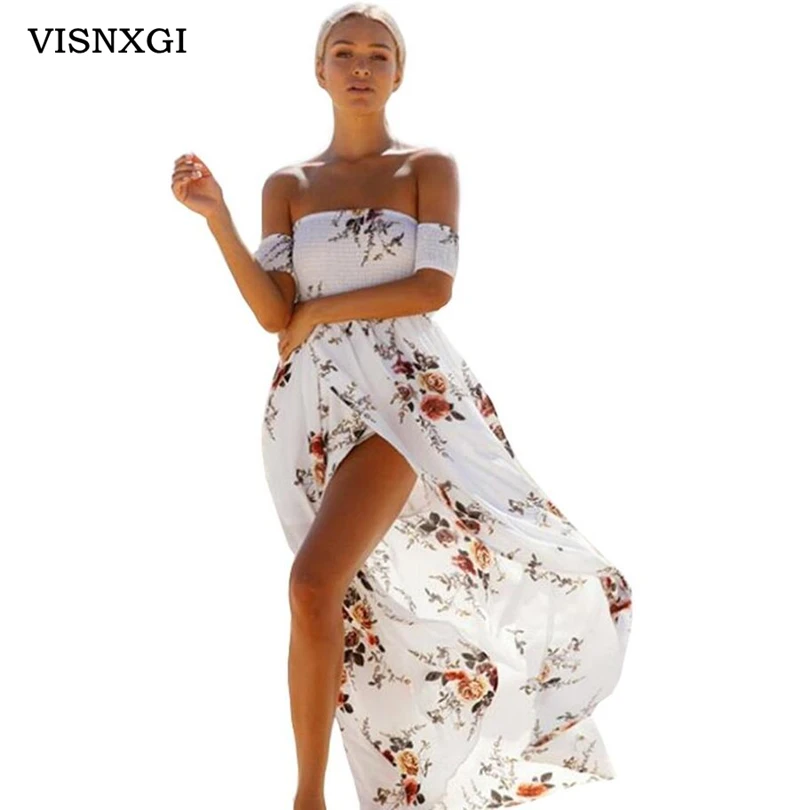VISNXGI Boho Стиль длинное платье для женщин с открытыми плечами пляжные летние платья цветочный принт Винтаж шифон Белый платье макси Vestidos