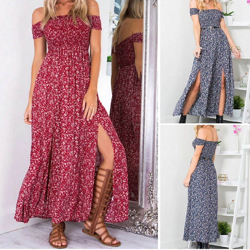 Богемное винтажное 2020 сексуальное платье с цветочным принтом и открытыми плечами, Летнее Длинное платье средней длины, вечерние женские элегантные пляжные праздничные платья-туники