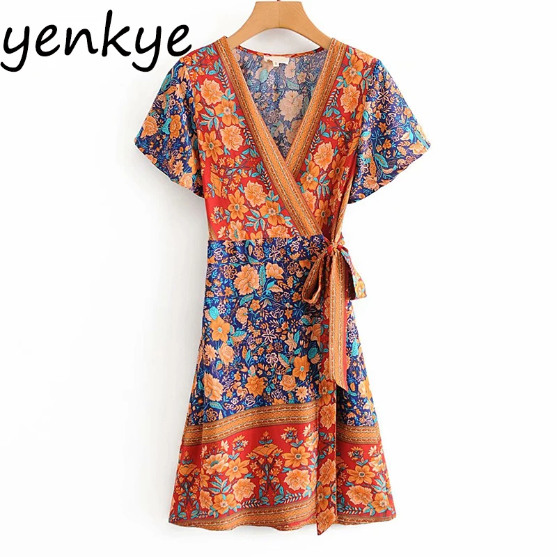 Женское винтажное платье в стиле бохо с цветочным принтом, повседневное пляжное летнее платье трапециевидной формы с v-образным вырезом и коротким рукавом DJF9081