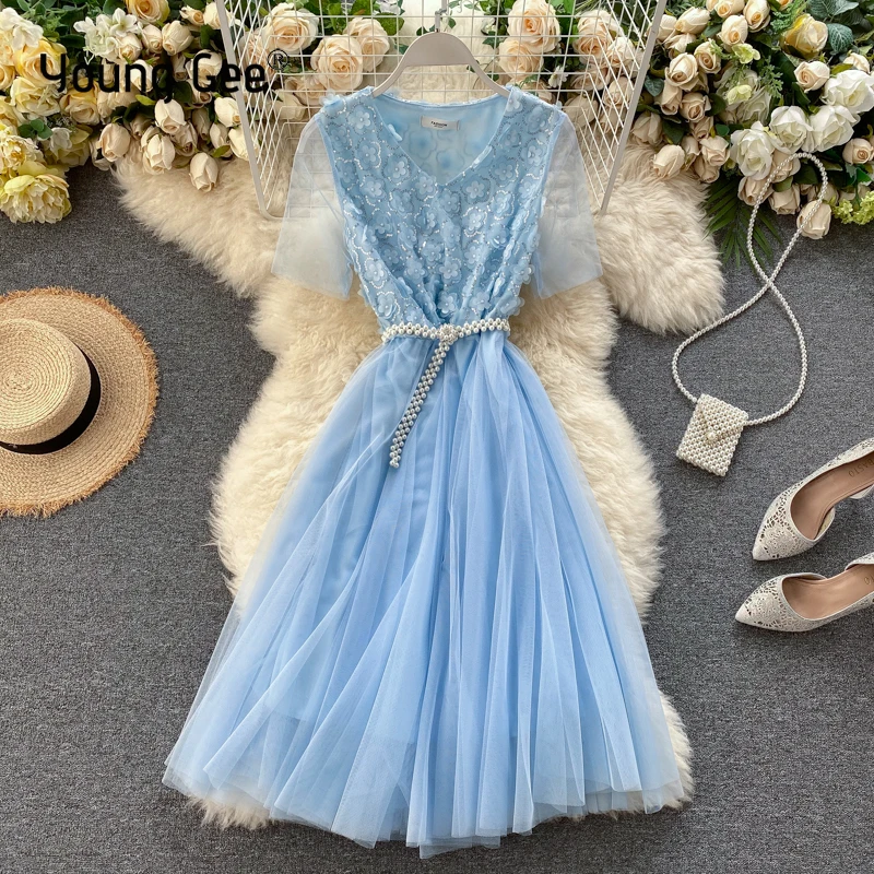 Young Gee летнее милое кружевное 3D платье с цветочным рисунком 2020 модное платье с коротким рукавом и круглым вырезом ТРАПЕЦИЕВИДНОЕ ПЛАТЬЕ с расклешенным поясом и жемчужинами Vestidos