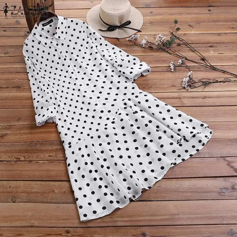 ZANZEA, женское летнее Мини платье, 2020, богемное, в горошек, с принтом, короткое, Vestidos, с отворотом, асимметричное, с оборками, с подолом, длинная рубашка-сарафан