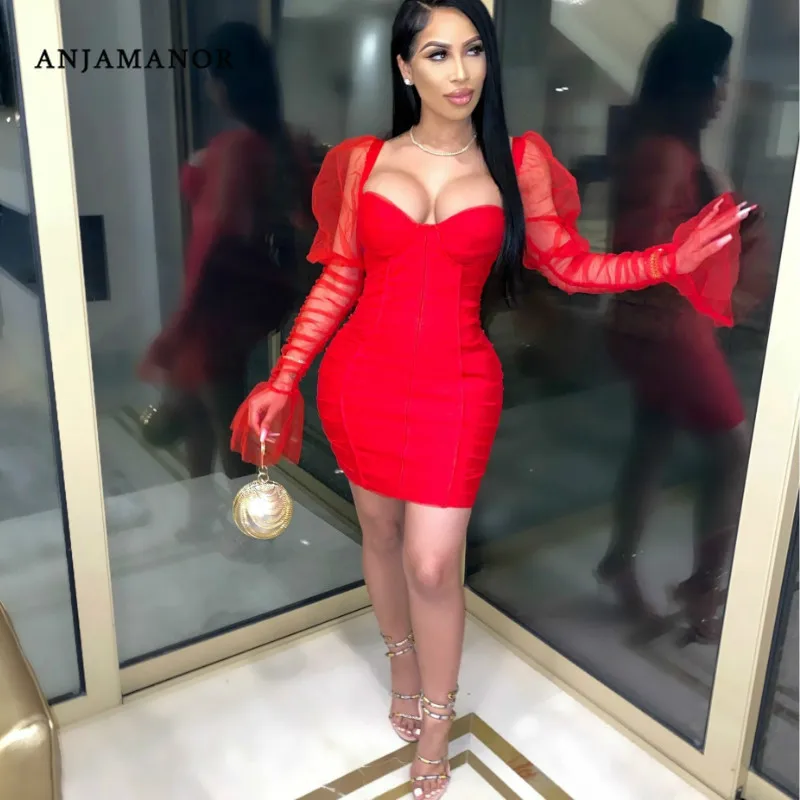 ANJAMANOR, сексуальные вечерние облегающие платья, женская одежда, 2020, летняя Клубная одежда, прозрачная сетка, пышные рукава, бандажные Мини платья, D19-AF84