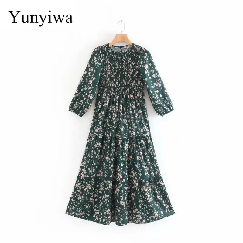 Новое Женское Плиссированное эластичное повседневное женское платье-миди с круглым вырезом и цветочным принтом, рукав три четверти, весенн...