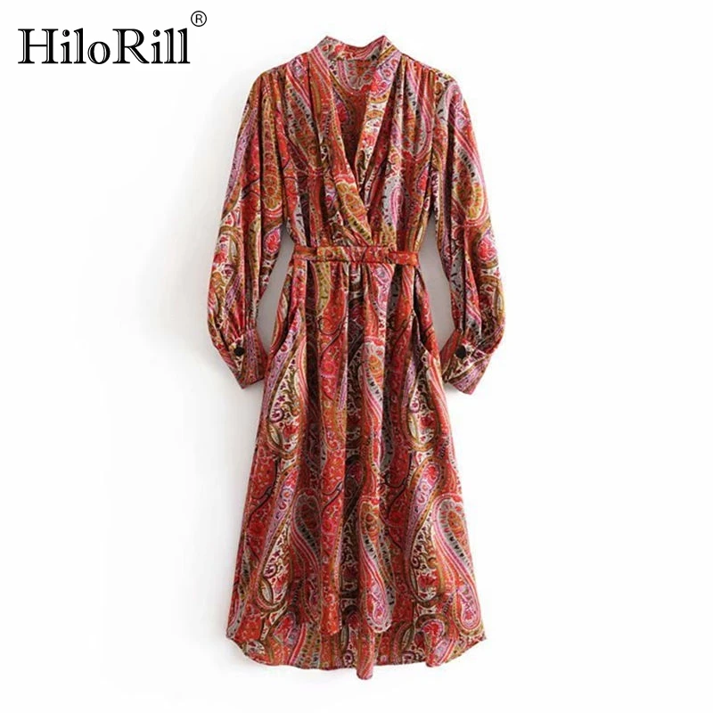 Сексуальное платье с глубоким v-образным вырезом, длинное платье с цветочным принтом, женское винтажное вечернее платье миди с длинным рукавом, повседневные женские платья с поясом, Vestidos
