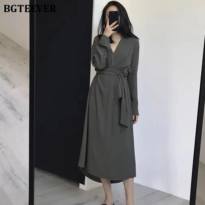 BGTEEVER 2019 весеннее винтажное повседневное свободное женское платье с v-образным вырезом и длинными рукавами на шнуровке женское платье Vestidos ...