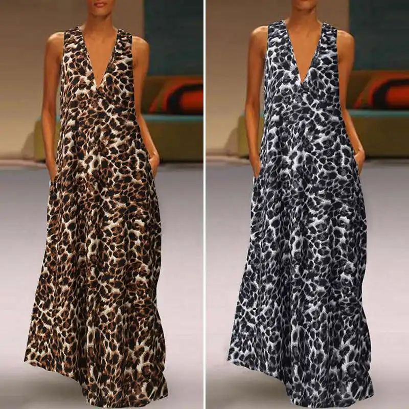 Летнее макси-платье без рукавов ZANZEA для женщин, богемное платье с леопардовым принтом, Пляжное Платье Vestidos, женское платье с v-образным вырезом, сарафаны 5XL, 2020