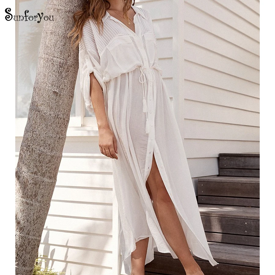 Летнее платье Бохо 2019 хлопок макси пляжная одежда Longue Vestidos пляжная туника с v-образным вырезом Сплит белое длинное женское Повседневное пла...