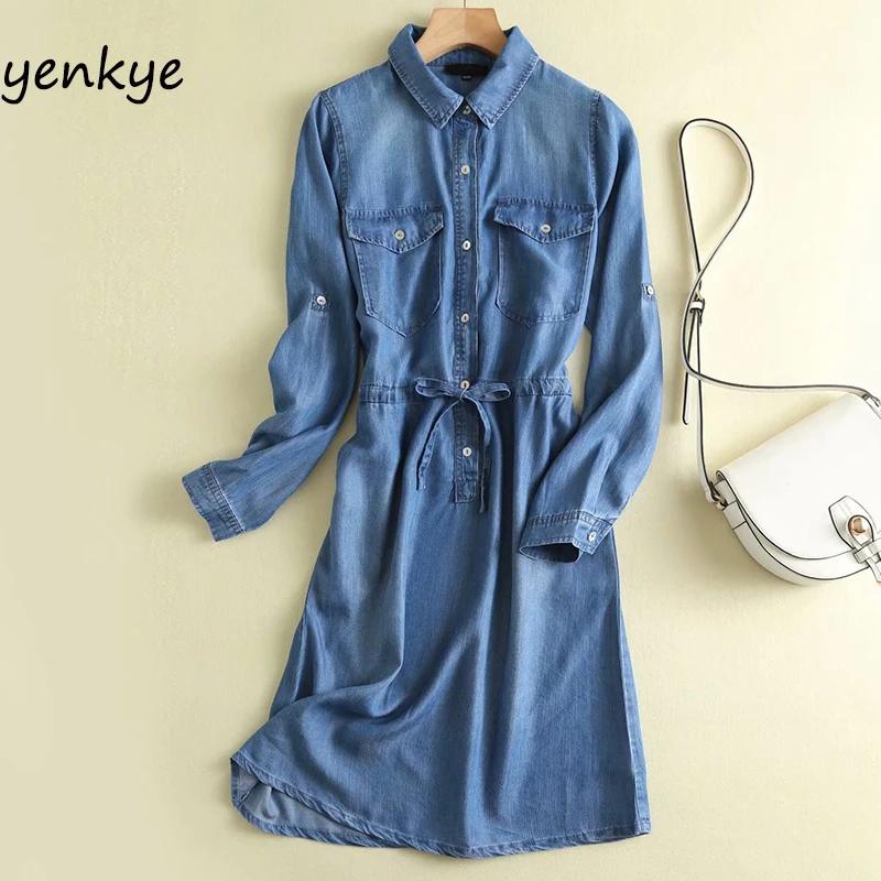Винтажное Синее джинсовое платье для женщин с длинным рукавом, воротником с лацканами, карманами размера плюс, Повседневное платье Весна 2020...