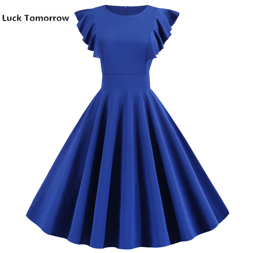 2019 Лето 50 60s винтажное платье халат фиолетовый сплошной цвет женские рукав-лепесток элегантные офисные вечерние платья средней длины De Fiesta