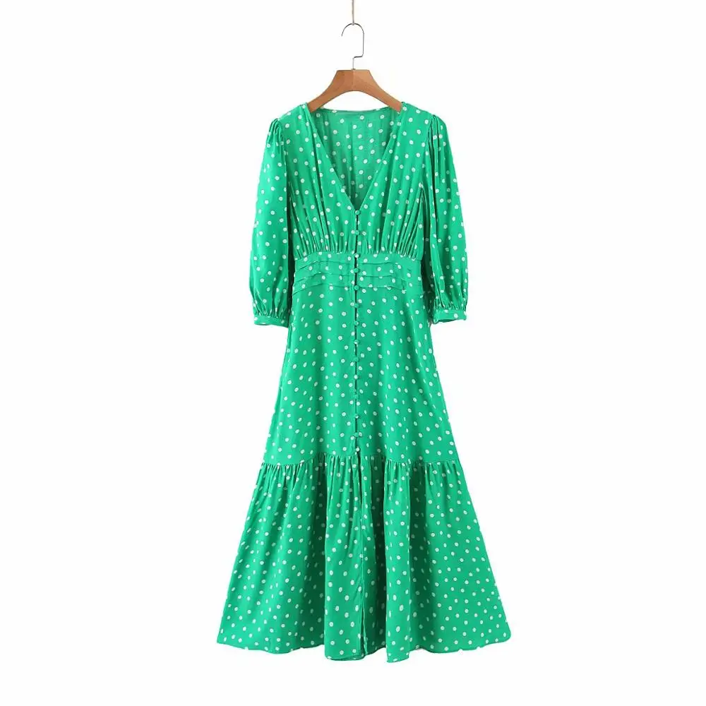 Новинка, женское элегантное платье-рубашка в горошек с v-образным вырезом, плиссированное платье в ретро стиле, рукав три четверти, vestidos, шикарное миди-платье DS3465