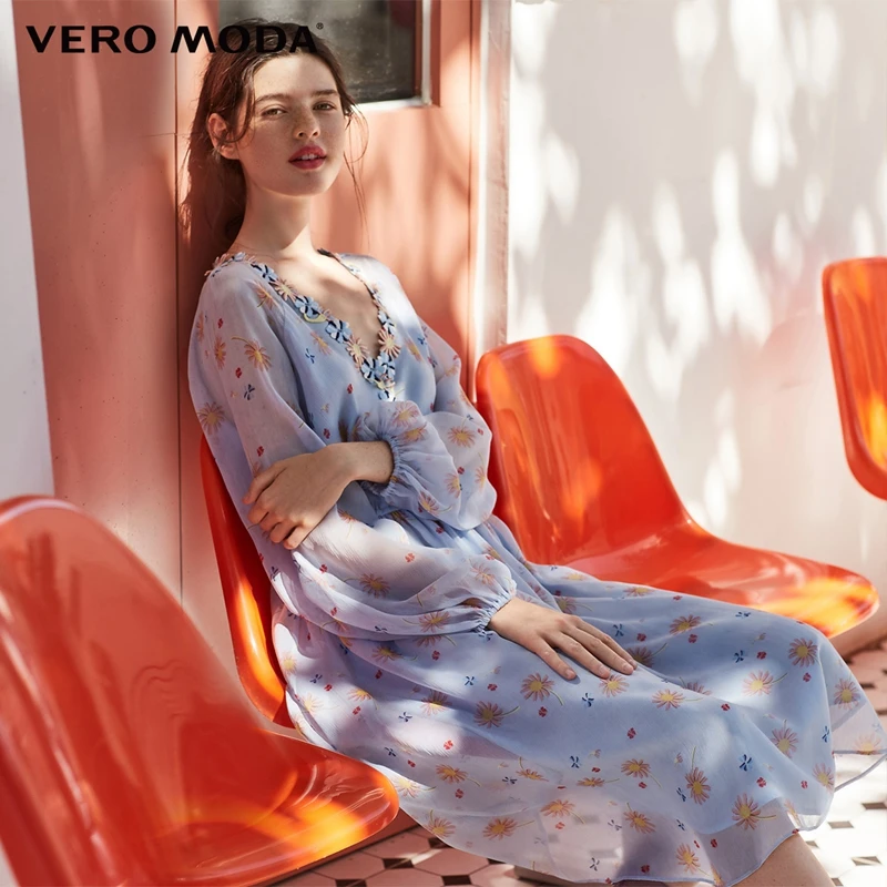 Vero Moda 2019 Ранняя осень новый тренд стерео наклейка v-образным вырезом фонарь рукав Высокая талия платье | 31837D505