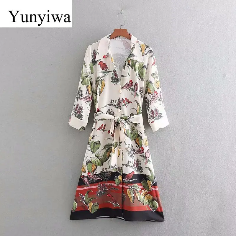 2020 New Summer Women Birds Leaves Position Print Casual Sashes Dress Female Three Quarter Sleeve Vestidos Kneeth Dresses