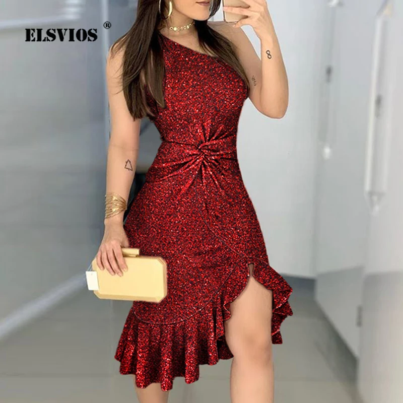 Весеннее блестящее платье с блестками на одно плечо для женщин 2020 летние вечерние платья с вырезом лодочкой и оборками сексуальное блестящее Облегающее Платье С перекрученной талией