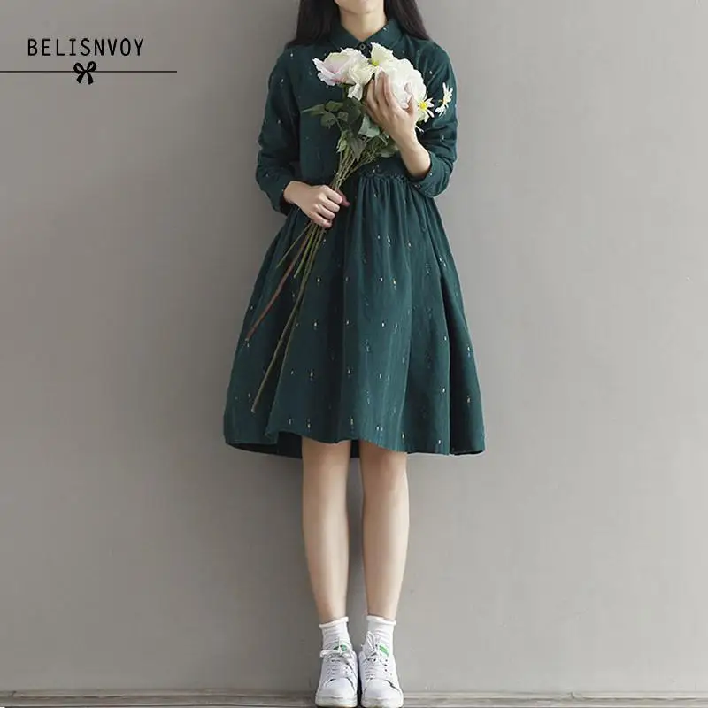 2019 осенние женские платья с отложным воротником с длинным рукавом повседневные свободные Vestidos Femininos вельветовое зеленое винтажное платье