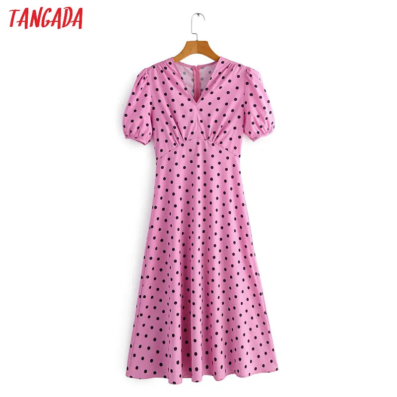 Tangada fashion women dot print pink summer dress short sleeve tunic ladies v neck work midi dress vestidos 2F34