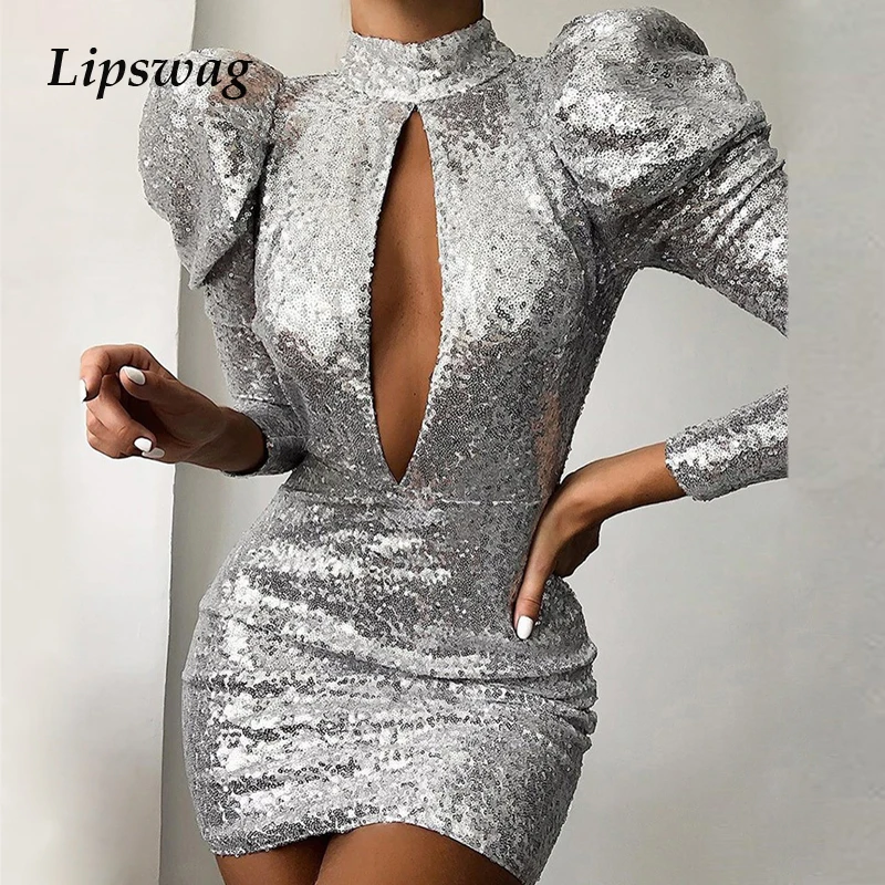 Пикантная обувь с низким вырезом на спине, с блестками платье Для женщин 2019 осень с длинным рукавом, с пышными рюшами, блестящие Клубные вече...