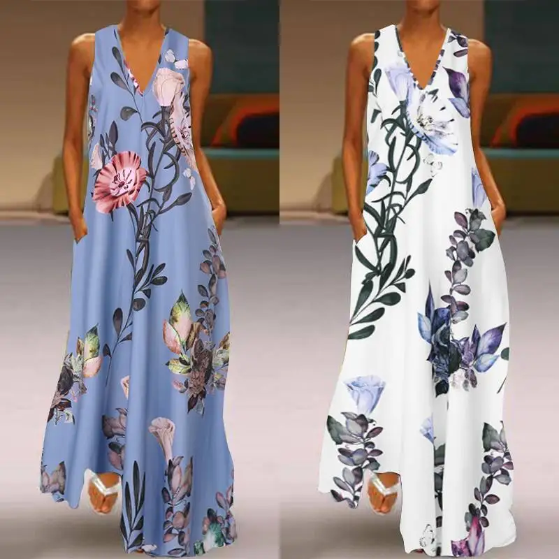 Высокое качество Лето 2019 г. новое поступление V воротник без рукавов с цветочным принтом плюс размеры M-3XL женщина шифон длинное платье