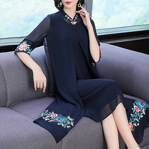 Весна-лето 2020, китайский стиль, вышивка, два костюма, платья, прямой принт, для мамы, свободного покроя, большого размера плюс, синий, красный дизайн
