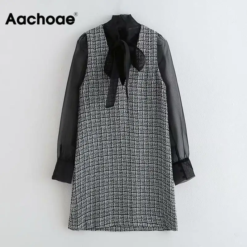 Винтажное женское мини-платье с галстуком-бабочкой и воротником в стиле пэчворк, элегантная женская одежда с прозрачными рукавами, свободн...