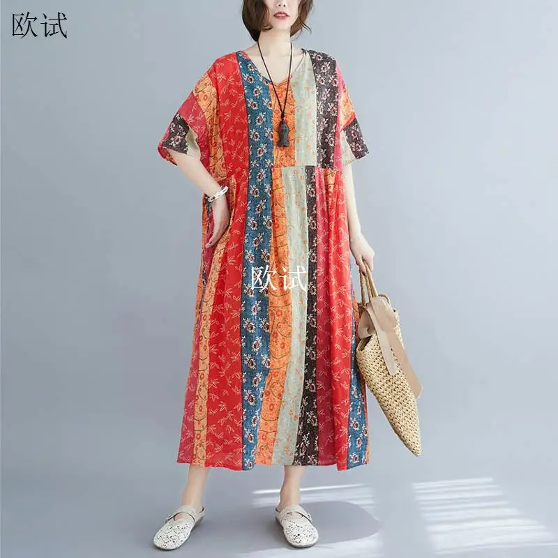 Женское длинное платье, винтажное, с цветочным принтом, из хлопка и льна, большого размера 5XL, 2020