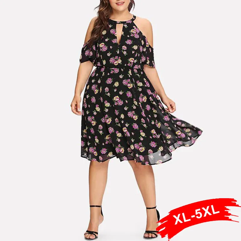 Плюс размеры с открытыми плечами Холтер V средства ухода за кожей Шеи бохо платье 3Xl 4Xl Лето цветочный принт средней длины шифоновые пла