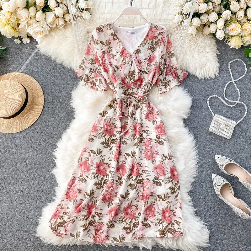 Весна-лето 2020, женское милое приталенное ретро платье с рюшами и v-образным вырезом, цветочным принтом, коротким Расклешенным рукавом, элегантное платье для женщин, Vestidos L460