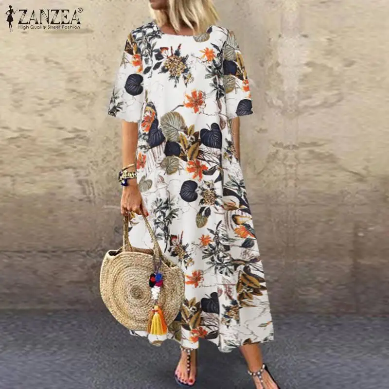 ZANZEA летняя с цветочным принтом Сарафан женское платье с v-образным вырезом и коротким рукавом женское пляжное платье Vestido Robe Femme платье с раз...