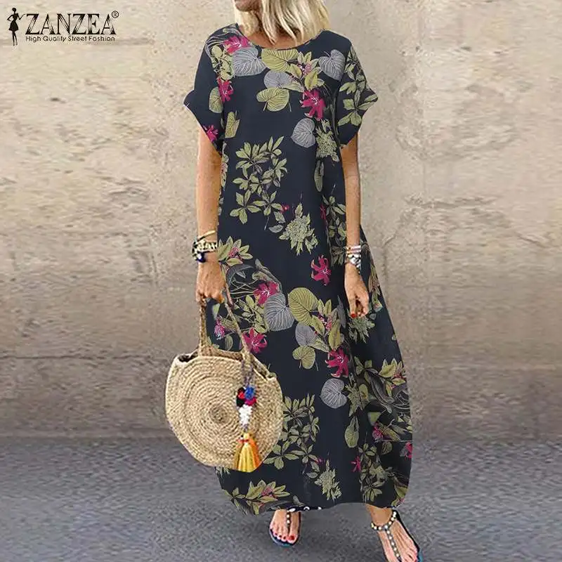 Летнее богемное летнее платье с цветочным принтом, ZANZEA, винтажное платье с коротким рукавом, женское повседневное хлопковое платье с круглым вырезом, Женская туника
