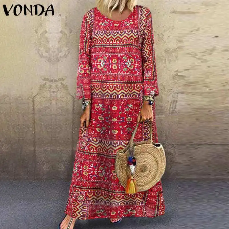 Длинное платье макси с принтом, женские богемные вечерние платья VONDA 2019, весеннее женское платье, повседневное винтажное платье с длинным рукавом размера плюс