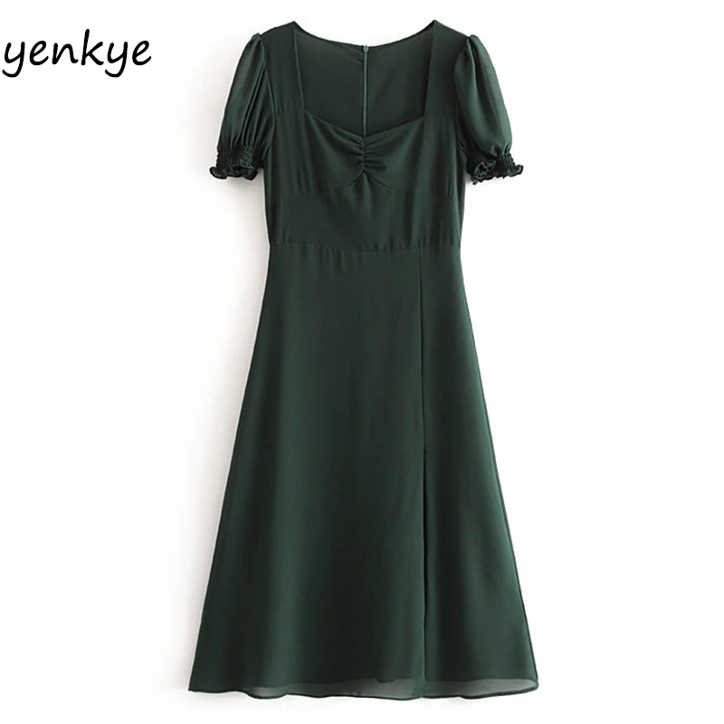 Женское винтажное зеленое летнее платье, элегантное женское платье с пышными рукавами и квадратным вырезом, сексуальные разрезы, ТРАПЕЦИЕВ...