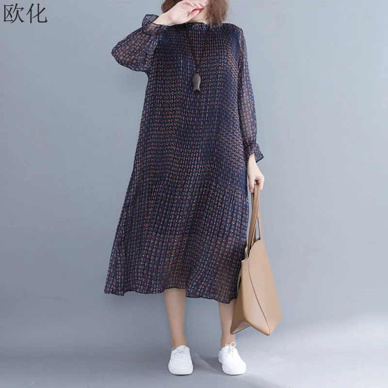 Женское шифоновое платье в горошек 2019 новое осенне-зимнее платье до середины икры с длинными рукавами длинные плиссированные платья 7160 50