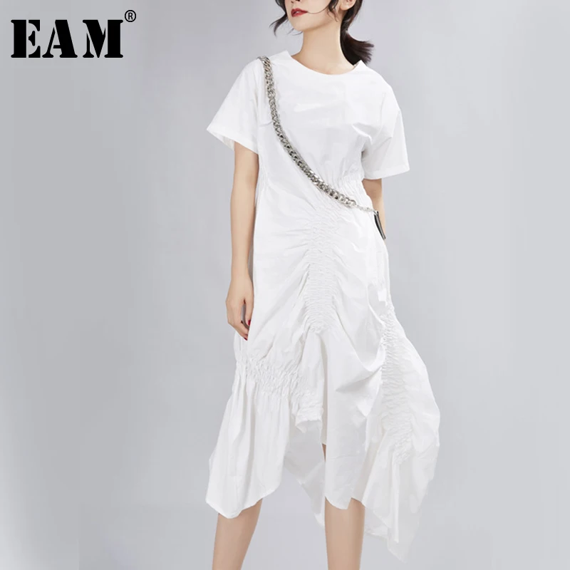 [EAM] 2019 Новое весенне-летнее черное плиссированное платье с круглым вырезом и коротким рукавом, свободное платье с разрезом, необычное женск...