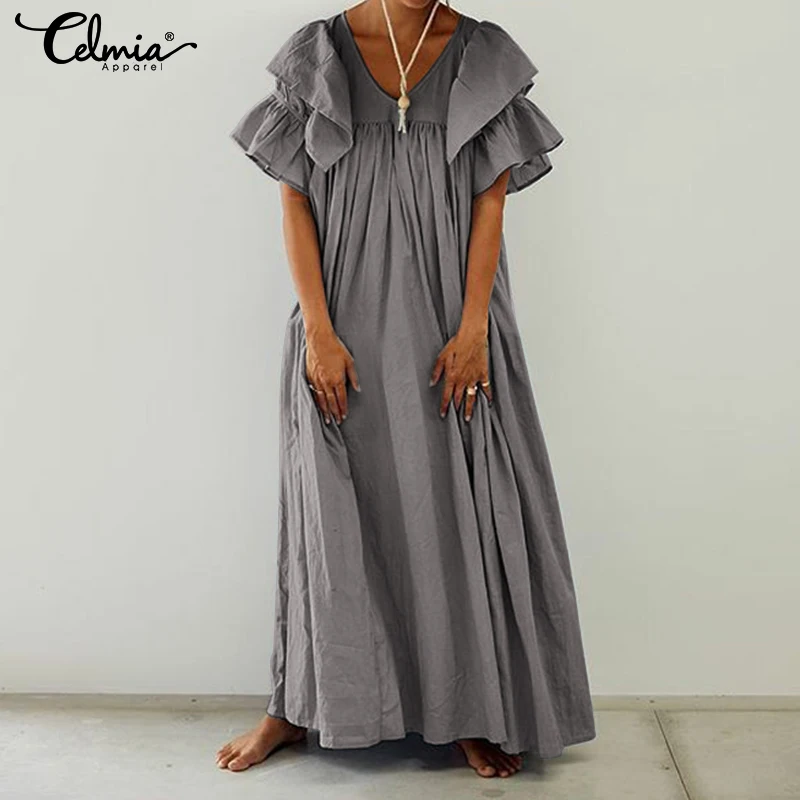 Женское летнее платье с рюшами, винтажная длинная рубашка-сарафан cellia 2019, повседневные свободные однотонные пляжные вечерние платья с коро...