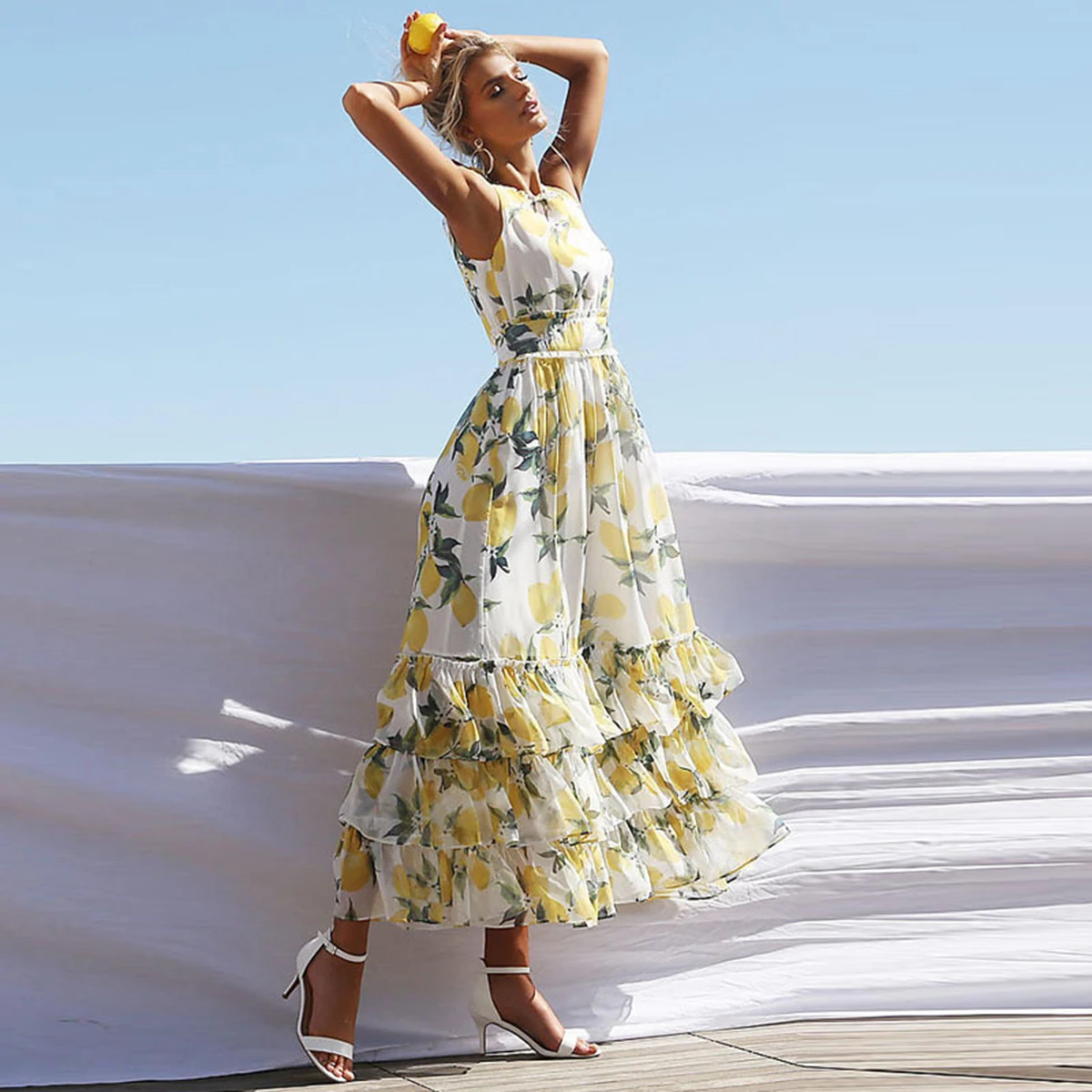 Женское платье макси с принтом лимона, летнее платье с О-образным вырезом и Каскадными рюшами, Пляжная повседневная одежда, длинное платье в стиле бохо, 2020