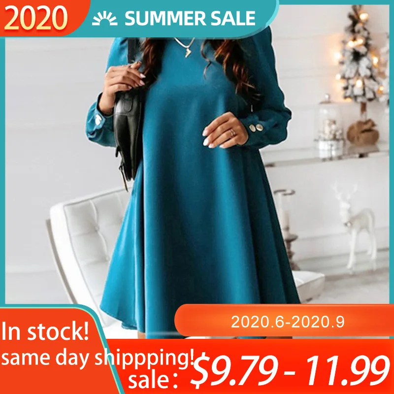 Женское мини-платье с металлическими пуговицами на спине и круглым вырезом, Осеннее элегантное женское платье трапециевидной формы с длинн...