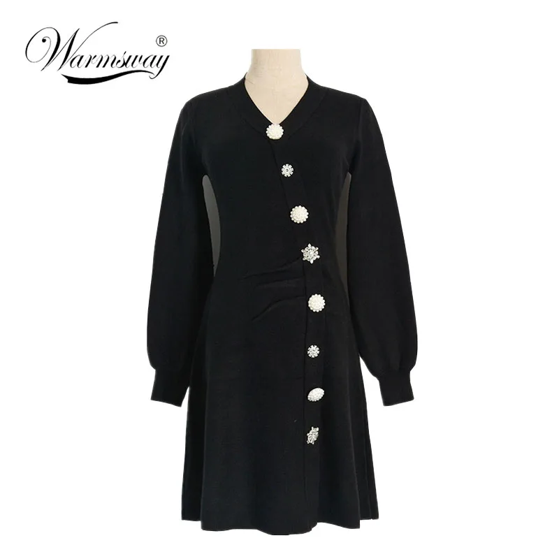 Новое платье с жемчужной пряжкой со скошенным плиссированным v-образным вырезом и рукавом-фонариком, вязаное платье, элегантное приталенно...
