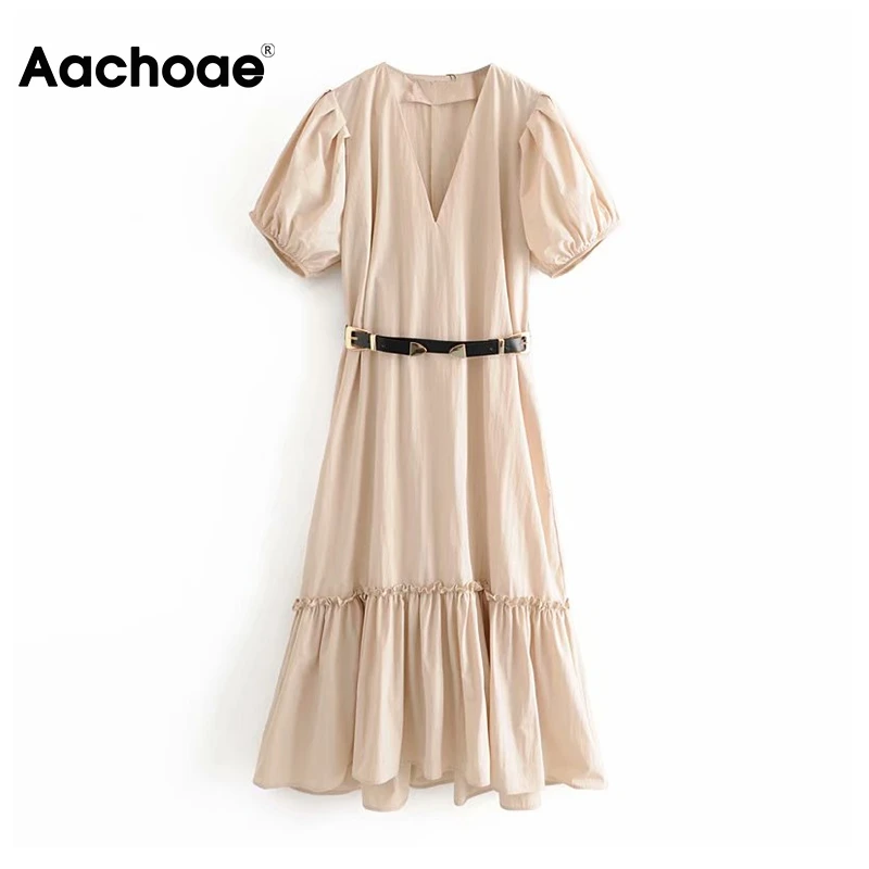 Элегантное платье миди с глубоким v-образным вырезом, пышное плиссированное платье с коротким рукавом и поясом, модные повседневные женские платья Vestidos Mujer