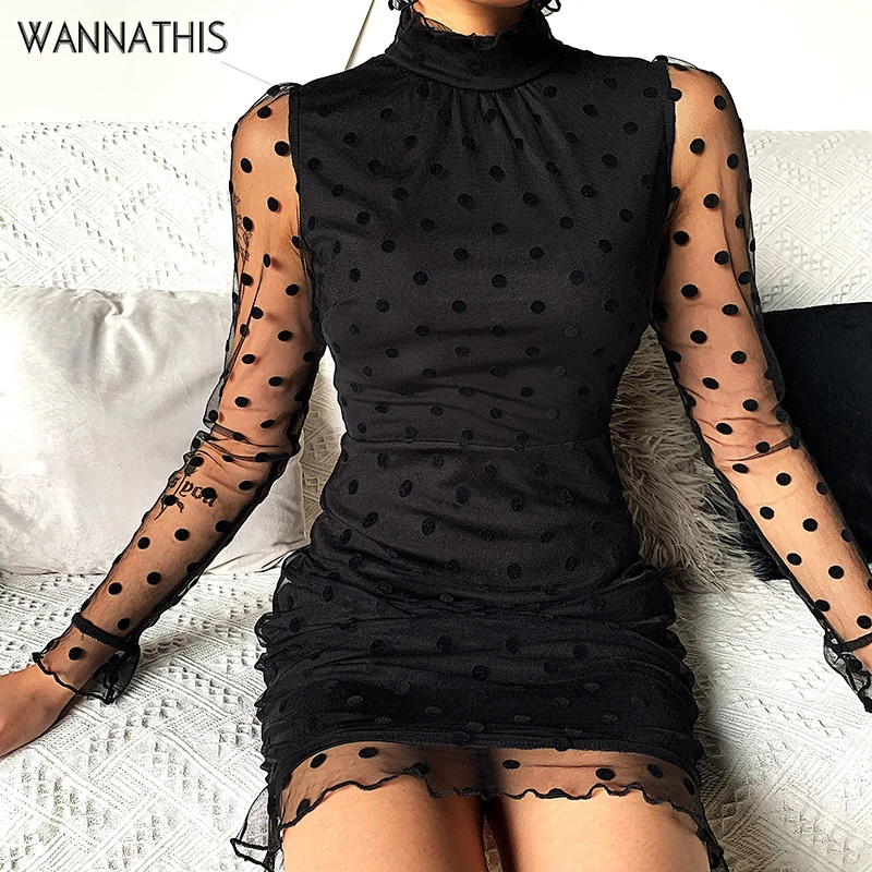 WannaThis, сексуальные платья для вечеринок в черный горошек, кружевные сетчатые платья с длинным рукавом и оборками, высокий воротник, женские элегантные мини-платья, новинка весны